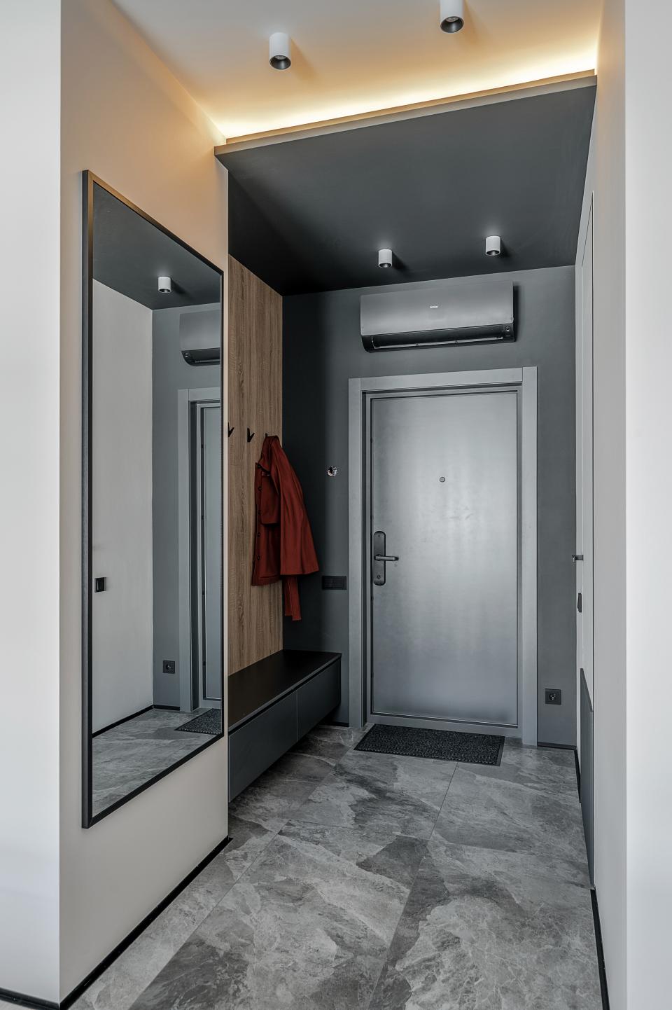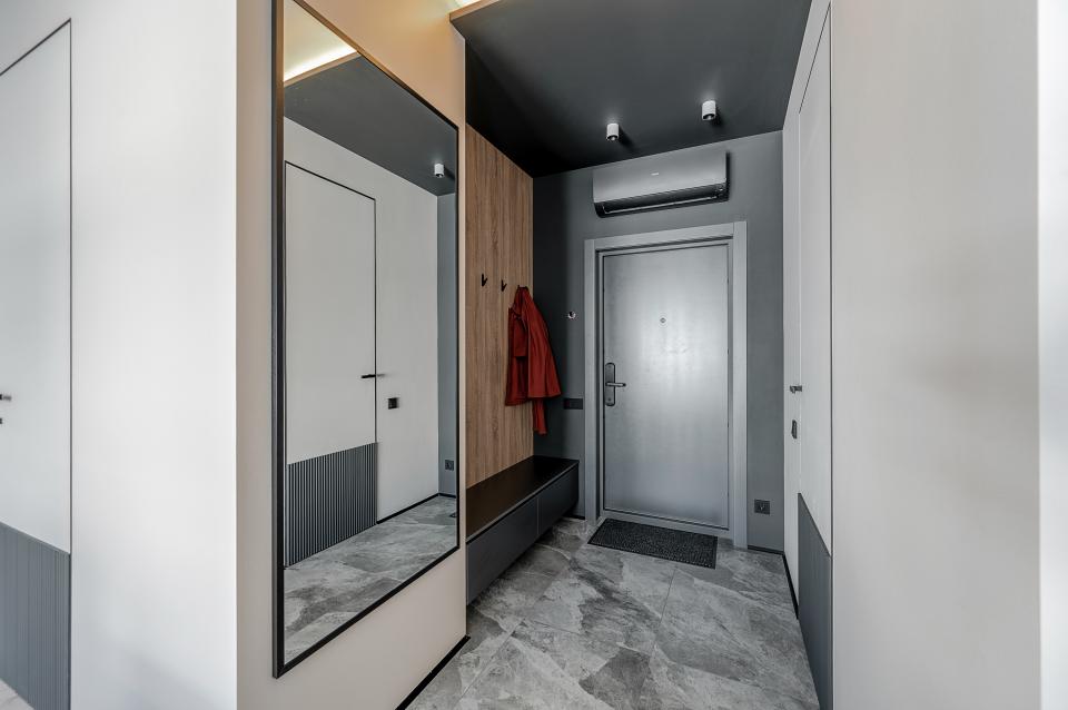 «Нам изначально хотелось сделать высокие дверные проемы, до 2400 мм. Такой архитектурный прием полностью меняет ощущение пространства в небольших квартирах: визуально увеличивает высоту, вытягивает пропорции помещений, дает больше воздуха. Особенно понравилась модель дверей с декоративным цоколем. Однако по бюджету она не проходила, и мы придумали свой вариант: со стороны гостиной наклеили на нижнюю часть обычных дверей скрытого монтажа рельефную панель Orac Decor и выкрасили ее в контрастный цвет. Получилось эффектно и экономично!» — резюмирует дизайнер.
