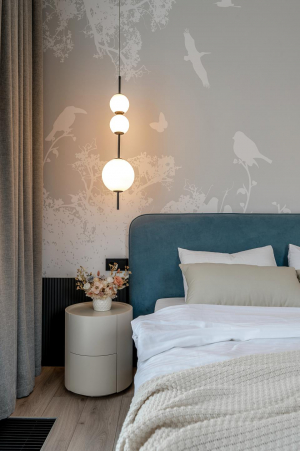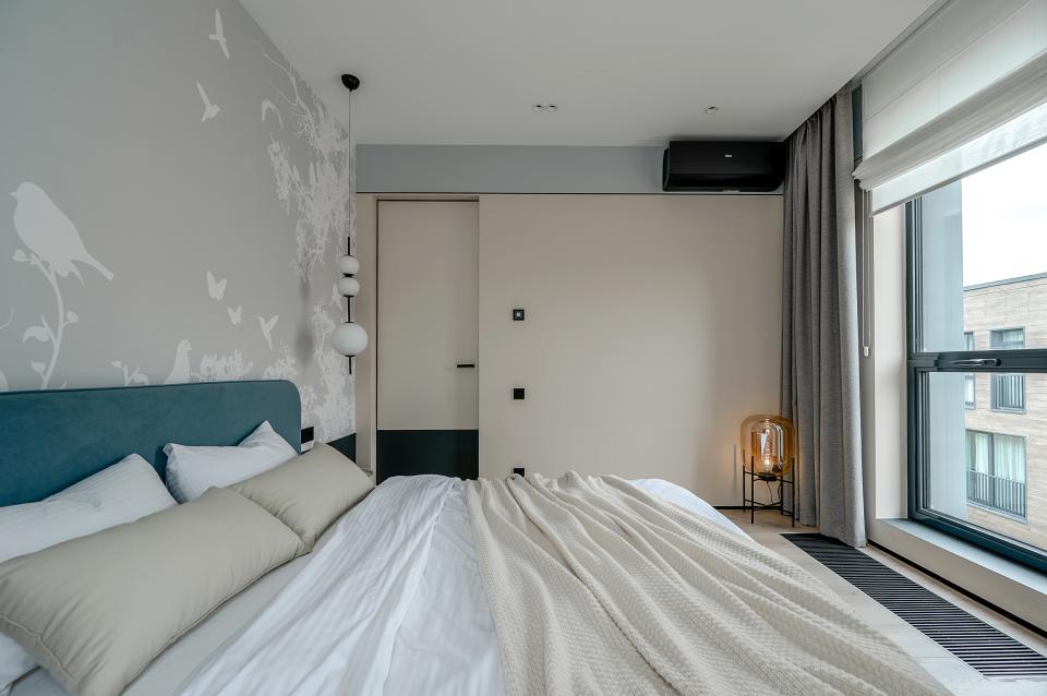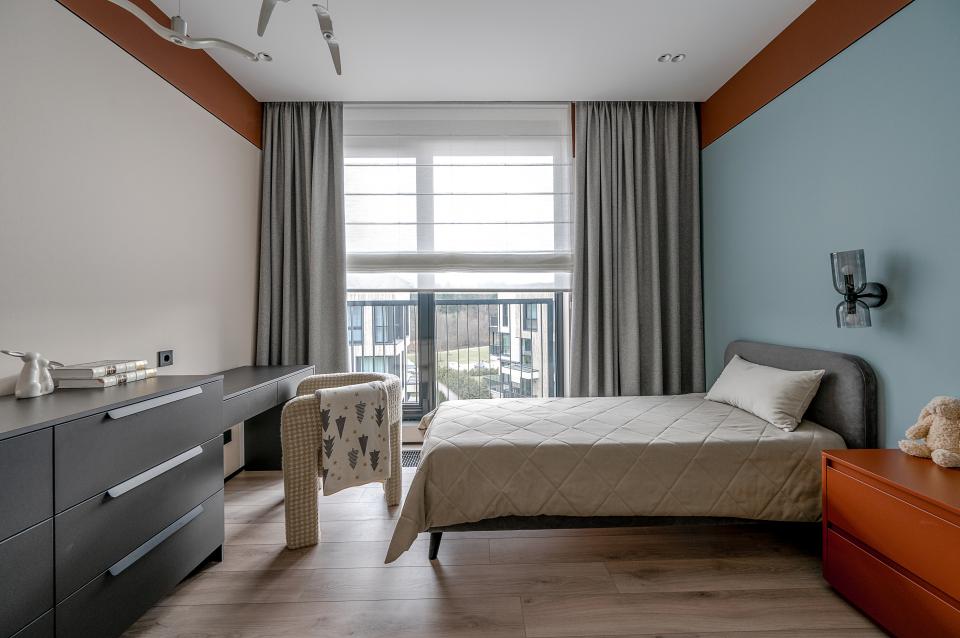 Гардеробная-прачечная и санузел компактно расположены при входе. «При разработке планировочного решения мы исполнили пожелание заказчика — сделать максимальное количество спальных мест. Поэтому, помимо двуспальной кровати в мастер-спальне, установили две кровати в детской и раскладной диван в общей зоне, тем самым адаптировав апартаменты для проживания большой семьи», — отмечает дизайнер. При расстановке мебели также важно было найти баланс между эргономикой и эстетикой, учесть расположение довольно внушительных напольных конвекторов и панорамных окон, которые добавляют загородному интерьеру особый шарм, но сильно ограничивают варианты меблировки.