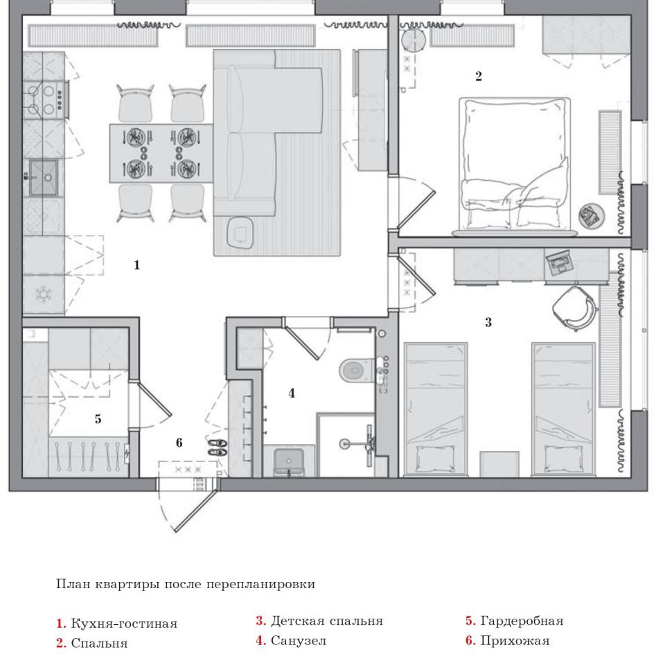 В остальном базовую планировку можно назвать удачной: квадратный план, правильная геометрия, хорошая освещенность — все это работает на создание ощущения большого светлого объема. Особенность организации пространства — отсутствие коридоров, нефункциональных буферных помещений и глухих дверей. Из холла напрямую попадаешь в общую гостиную-кухню, а из нее — в две изолированные спальни: главную и детскую.
