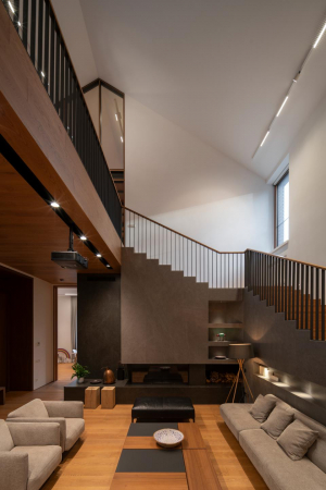 Дотошному читателю помогут разобраться в продуманном функционировании и планировочно-пространственных секретах дома подробные планы и разрезы, а мы бы с удовольствием провели время в гостиной-каминной. Ибо здесь во всей полноте раскрывается масштаб архитектурного замысла. Пространство каминного зала открывается во внешний двор, оно поднимается во второй этаж и на антресоли пяти спален, а также «спрятанной» здесь же творческой мастерской, тайно выходящей на просторную террасу – кровлю рекреационного навеса.