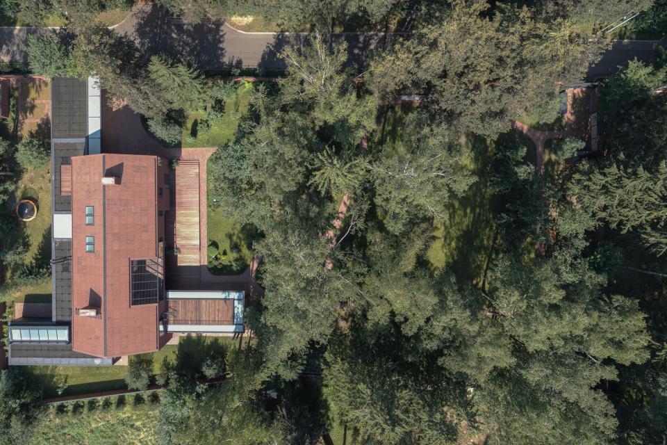 Расположение в старом писательском посёлке на окраине города Троицк в Новой Москве – одна из важных особенностей дома Сергея Скуратова. Неслучайно мы взяли для эпиграфа строки из стихотворения Николая Асеева. Это поэтичная зелёная среда скорее дачной (почти лесной), нежели поселковой застройки. И так же как окружающие дома, обширная усадьба (на 10 человек – семей Скуратова, Золотовой, Мансилья-Круз) тактично спрятана в этом «лесу».