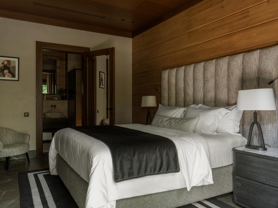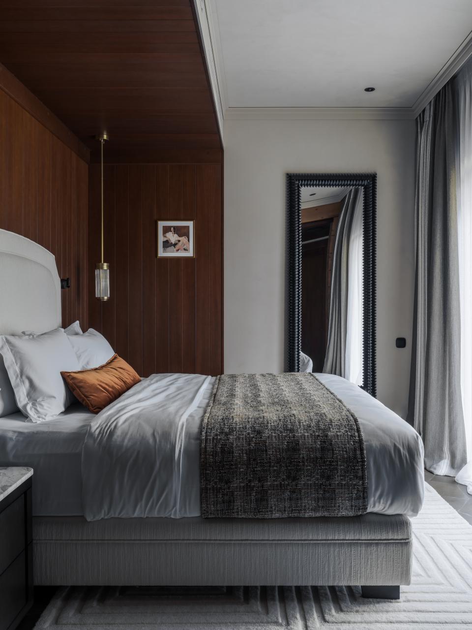 Расположенная в центре дома гостиная связала два крыла. В приватном крыле находятся две спальни, а SPA-блок занимают отдельный санузел и баня с эффектной парной. Расслабленной обстановки в спальнях команда проекта добилась с помощью сделанных на заказ кроватей. Вместе с бархатистыми изголовьями они были выполнены российской фабрикой. Помещение главных покоев отличается дополнительной перегородкой, отделяющей спальное место от аккуратного столика для макияжа и прохода в санузел.