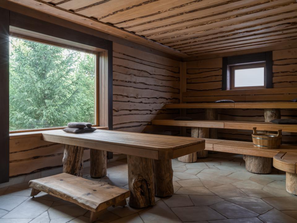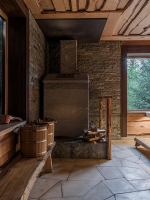 Комнату отдыха и парилку в банном крыле хотелось наполнить ощущением воздуха, поэтому их визуально увеличили за счет панорамного остекления. Полы обеих зон почти полностью отделаны камнем. Поскольку этот комплекс точно будет пользоваться популярностью, стены здесь украсили изысканным натуральным травертином в обработке «антик». Его завораживающая текстура призвана сделать процесс парения настоящим таинством. За создание уютного и атмосферного интерьера здесь отвечает скрытый свет, подчеркивающий фактуру деревянных скамеек. Дверные откосы в парной выполнены в виде каменных порталов из мрамора Петра Грей.
