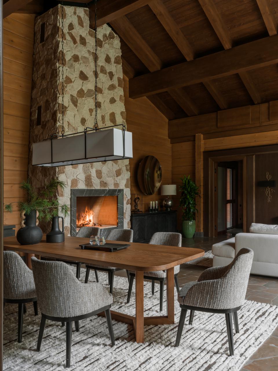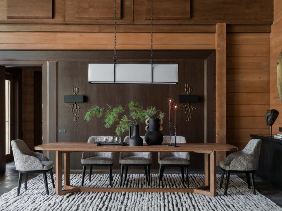 Противоположная часть комнаты отведена под обеденную группу, подходящую для приема гостей и теплых семейных встреч. Органично зонировать большое пространство помогли белые ковры: их оттенок контрастирует с природным камнем на полу. Землистый подтон шлифованного плитняка пришел из экстерьера: обычно этот материал используется для садовых дорожек, а здесь он скрадывает переход между домом и зеленой территорией. Окружающая коттедж природа часто находит продолжение в палитре оформления: Мария Ксенофонтова выбрала сразу несколько благородных пород дерева. Светлые и темные панели сменяют друг друга, поддерживая общий характер интерьера.