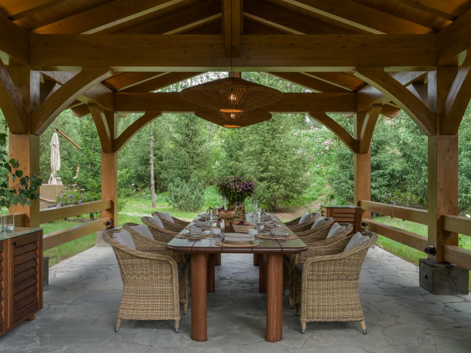 Подмосковный гостевой дом площадью 205 кв. м расположен в загородном парке «Ближняя Дача». Его архитектурный облик решен в стиле шале: простая геометрия одноэтажного здания с двухскатной крышей органично вписалась в ландшафт парка. Стены дома выполнены из клееного бруса. Брутальность архитектурных форм смягчает фактура древесины, которую сохранили во внутренней отделке помещений. Она же естественным образом украшает открытую беседку во внутреннем дворике. Эта зона отдыха рассчитана на двенадцать гостей и оснащена комфортной мангальной зоной — летом она превращается в место для барбекю и дружеских посиделок на природе.