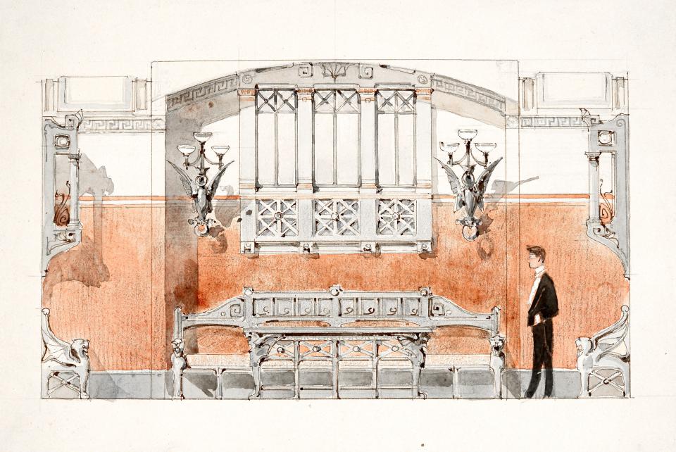Оформление интерьера кабинета в ресторане Н.П. Мартьянова в здании Верхних торговых рядов в Москве. Середина 1900-х гг. Из собрания Музея архитектуры им. А.В. Щусева