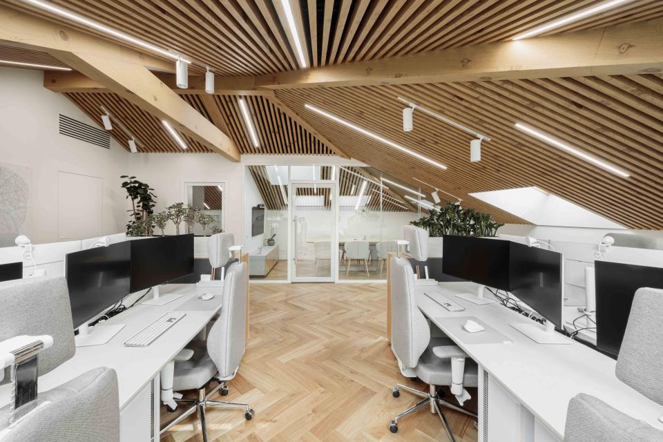Из пояснительной записки авторов проекта: подготовка высококвалифицированных IT-специалистов — ключевая задача цифровой экономики. Архитектурное бюро UNK corporate interiors совместно с VK Education создаёт современные учебные центры в ведущих вузах России, включая МГТУ им. Баумана и РАНХиГС. VK Education — образовательное направление VK, которое помогает студентам развиваться и строить карьеру в IT и digital-сфере, предоставляя онлайн-практику, стажировки и образовательные программы.