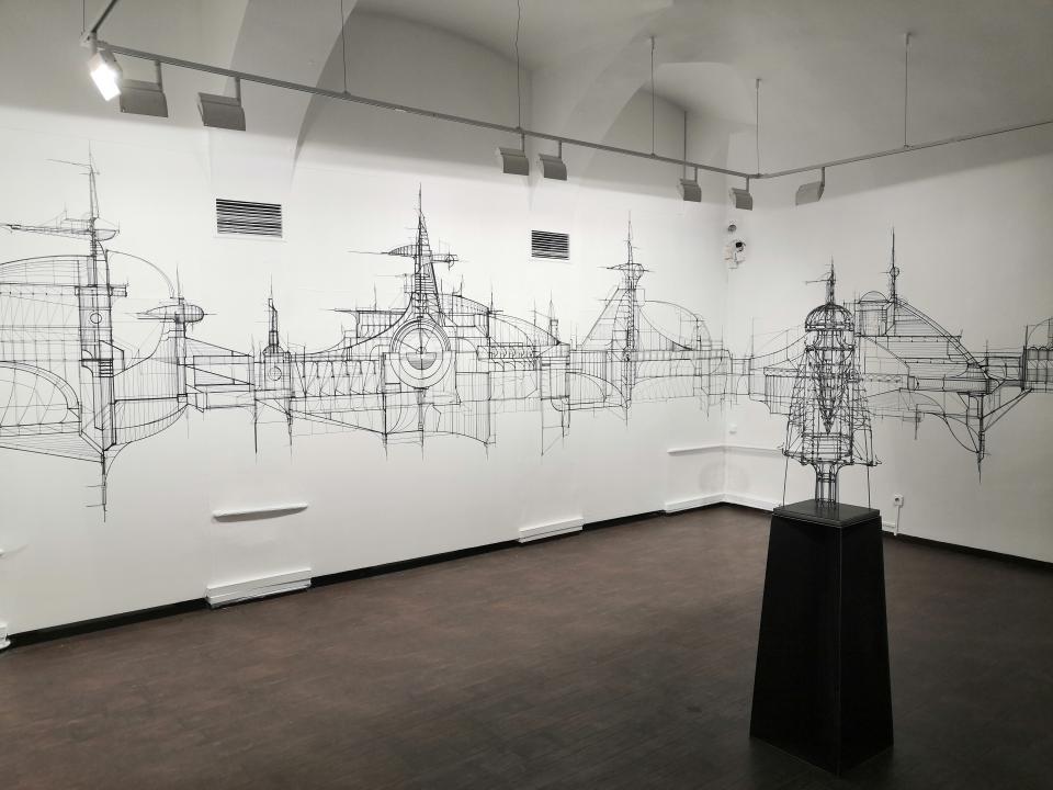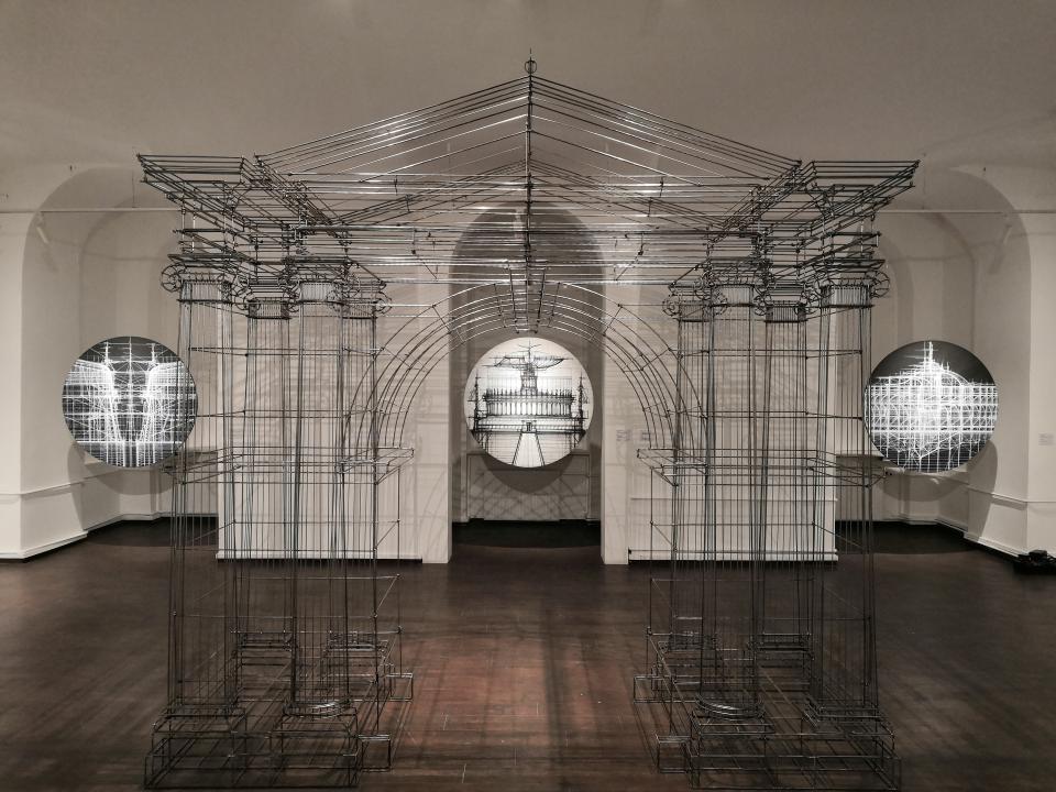Выставка относительно небольшая, проходит в двух залах музея. В одном расположидись работы художника и огромная триумфальная арка, выполненная из металлической проволоки.