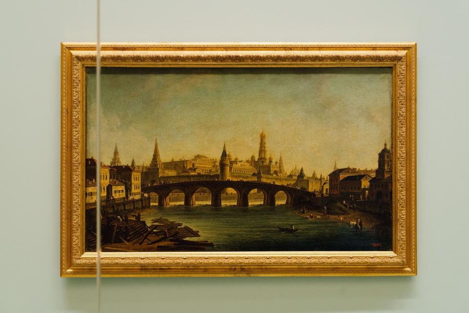 Вид Кремля с того же ракурса в исполнении другого замечательного художника, Максима Воробьева, тоже можно увидеть в разделе «Старая Москва». Воробьев был большим мастером классического архитектурного пейзажа, свой «Вид Московского Кремля со стороны Каменного моста» он написал чуть позднее Алексеева, в 1818 году. Здесь на угловой Водовзводной башне заметны следы разрушений: башни и стены Московского Кремля пострадали во время французского нашествия 1812 года.
