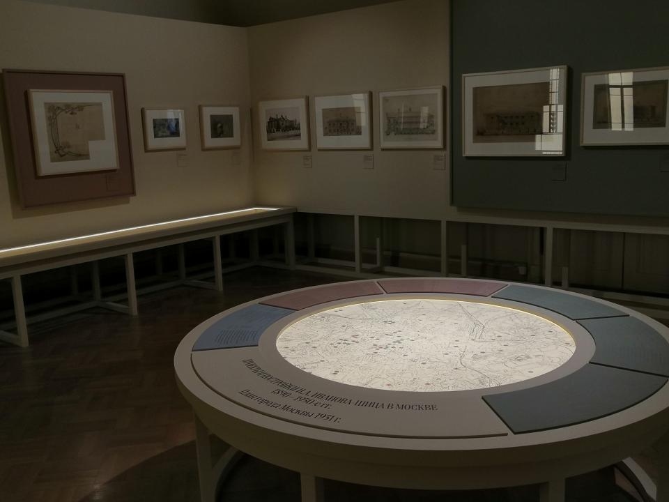 Открывает экспозицию план Москвы с нанесенными на него отметками мест расположения построек архитектора, они структурированы по категориям – сохранившиеся, утраченные, не реализованные.