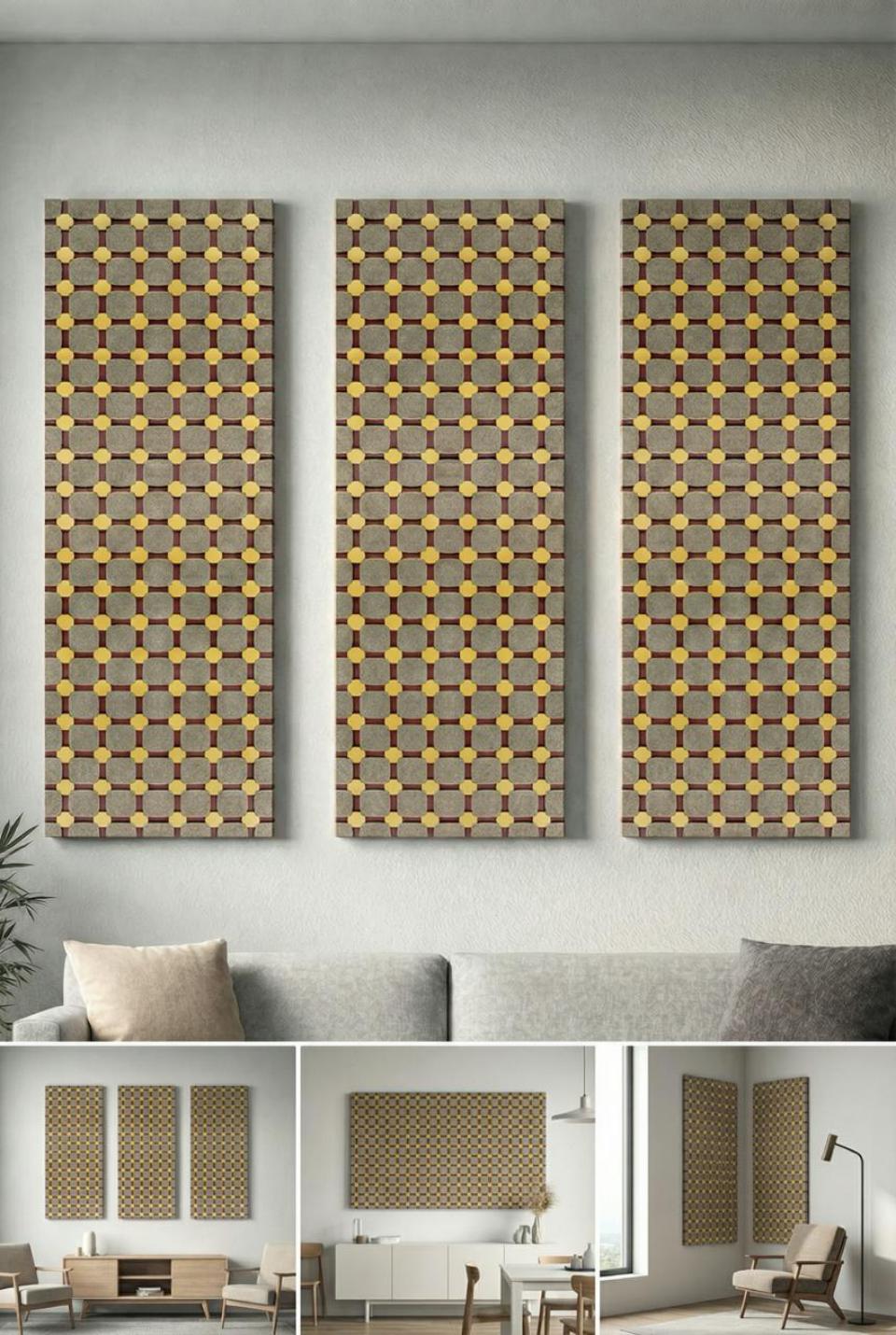 Для снижения шума можно интегрировать в интерьер панели различного размера, собирая декоративные композиции.