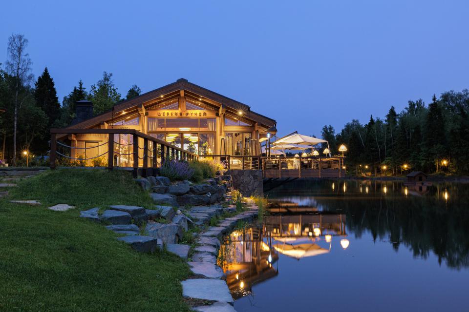 Сделать пространство комфортным в любое время года призваны крытые павильоны, решенные в едином стиле. Они напоминают традиционные европейские шале со скатными крышами и строгими деревянными фасадами. У воды расположился остекленный павильон с поэтичным именем «Девкин ручей». Постройка сначала задумывалась как место для летнего отдыха, но в процессе проектирования превратилась в полноценную досуговую зону с отоплением.